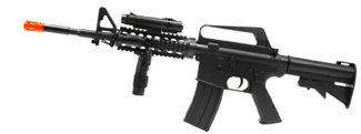 M16-A4 Airsoft Carbine Assault Rifle - Manufactured by Leading Airsoft Gun Manufacturer, WELL (model 16-A4) - Made of Durable ABS Plastic & Inside Metal Parts - Full Size: 1/1 Scale Replica of the Colt M4 Carbine - Spring Powered - Realistic! Manual Cocking Required Before Each Shot - Fires Standard 6mm Plastic BB's or 6mm Paintballs - Magazine Capacity: 20 rounds - Velocity: approx 270 FPS - Changeable HOP UP System for Best Shooting - Mountable Twin Flashlight for Night Action - Adjustable Laser Aim Module - Dimensions: 33" L x 9" H x 2" W Safety Glasses - Shoulder Strap - Pack of Plastic BB's - Batteries for Flashlight - Screwdriver - Weight: 4lbs.