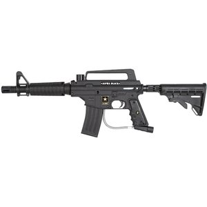 "The US Army Paintball Alpha Tactical Edition paintball marker with an eGrip is set-up with an M16-style 6-position collapsible stock and an M16-style shroud with a built-in sight. The e-Grip provides semi-auto, 3-shot burst, and full safety auto modes. It features a realistic military appearance, operates with an in-line bolt system, and includes an all-aluminum die-cast receiver, a stainless-steel gas line, and a quick-release feeder elbow."